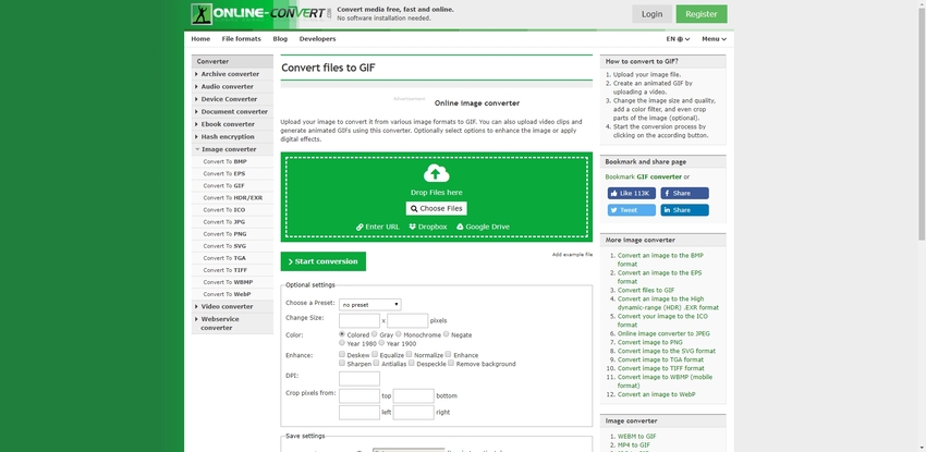 Online Convert also offers you to convert MPG to GIF format using your browser directly. This converter website is ancient and very popular among the people. There is an extension provided by the site which can be installed in the browser and directly offers you related converter while visiting the webpages. It supports browsing files from the URL of images, computer, Google Drive, and DropBox.