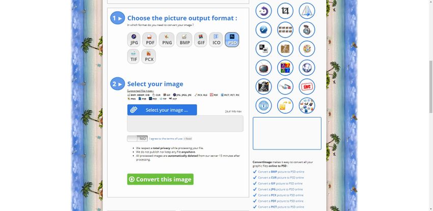 Step 2. After choosing the PSD as your output format click the Select Your Image button and choose PNG image from the computer. Now agree the terms and conditions of the website.