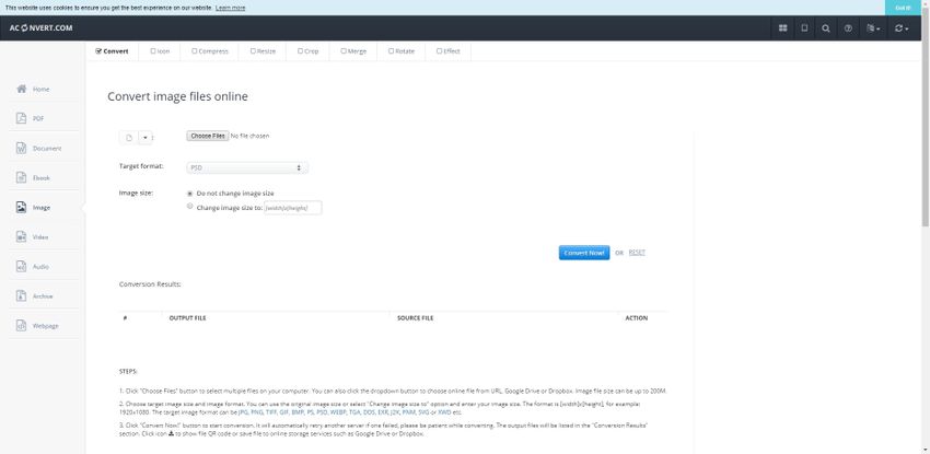 AConvert website is also an online tool which helps users to quickly convert PNG to PSD using your browser. AConvert is free to use website and works online so you can easily convert all your files without installing any software. While using this online converter you need to make sure that you have a good internet because to upload files for conversion and download them after conversion you need internet connection. Without internet this is not possible to use this website.