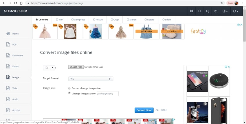 With AConvert, PSD images on the system, link, Google Drive, and Dropbox can be accessed and added to the program for the process. In addition to PNG, some other image formats are also supported as the target files. If needed, the image size can be edited by choosing the height and width.