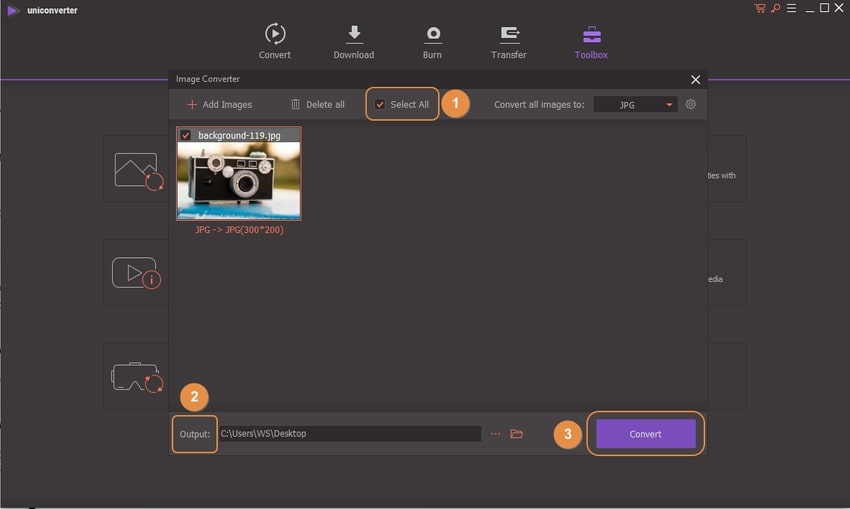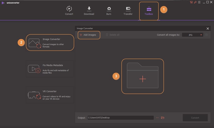 Choose the Toolbox tab from the main software interface and select the Image Converter option. A new pop-up window opens from where click on the +Add Images option or on the +sign to browse and load RW2 files. Multiple files for batch processing can be added.