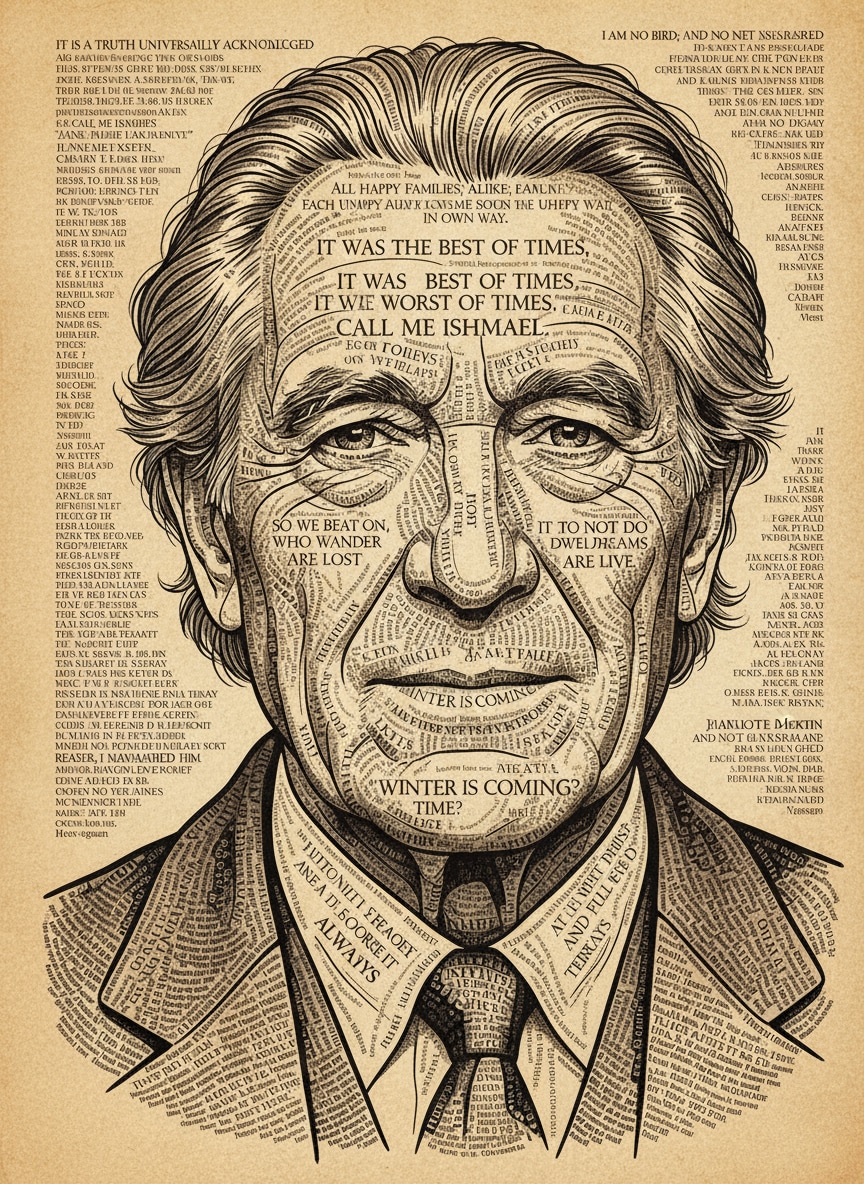 Create an elegant author typography portrait using classic literary quotes and famous book excerpts. TEXT CONTENT TO USE: "It is a truth universally acknowledged, that a single man in possession of a good fortune, must be in want of a wife." "All happy families are alike; each unhappy family is unhappy in its own way." "It was the best of times, it was the worst of times." "Call me Ishmael." "In my younger and more vulnerable years my father gave me some advice that I've been turning over in my mind ever since." "So we beat on, boats against the current, borne back ceaselessly into the past." "Not all those who wander are lost." "It does not do to dwell on dreams and forget to live." "After all this time? Always." "The night is dark and full of terrors." "Winter is coming." "I am no bird; and no net ensnares me." "Reader, I married him." LITERARY AESTHETIC: - Opening lines of famous novels positioned prominently at forehead (14-18pt) - Classic prose flows naturally through facial contours in elegant 11-13pt font - Famous quotes and memorable phrases emphasized in key features - Paragraph-like text blocks create natural shadows in darker areas - Author names subtly integrated into hair or background areas ARTISTIC STYLE: Sophisticated book cover quality, reminiscent of classic Penguin or vintage novel covers, elegant serif OR modern sans-serif typography, cream/off-white background with black text OR sepia-toned vintage aesthetic, perfect for author website headers, book marketing materials, writer portfolio pieces, literary magazine features, bookshelf display art. |