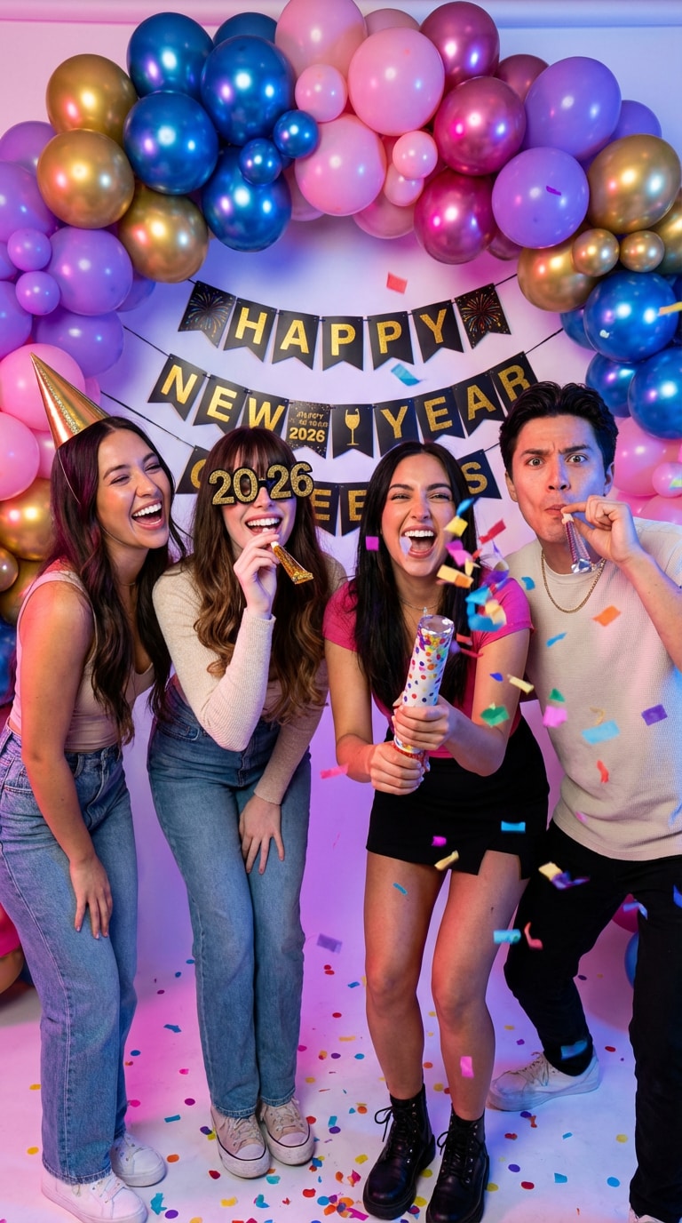 Create a fun New Year 2026 friends group photo. 3-5 friends posing energetically with party props - noise makers, party hats, "2026" glasses. Background: colorful balloon arch, photo booth setup with festive banners. Everyone making playful expressions and gestures. Confetti cannons frozen mid-air. Bright studio lighting with colorful gels. Casual trendy outfits. Keep all facial features unchanged. Joyful friendship vibe with vibrant colors. |