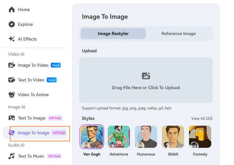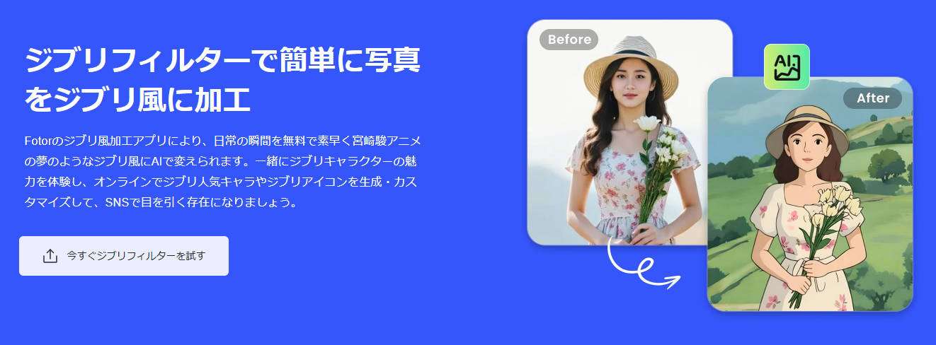 「Fotor」は、AI画像生成機能に加えて、画像編集機能も充実しているのが魅力のオンラインサイトです。ジブリ風やアニメ風エフェクトをAIで自動適用できるし、写真が素早くジブリ風に変えられます。