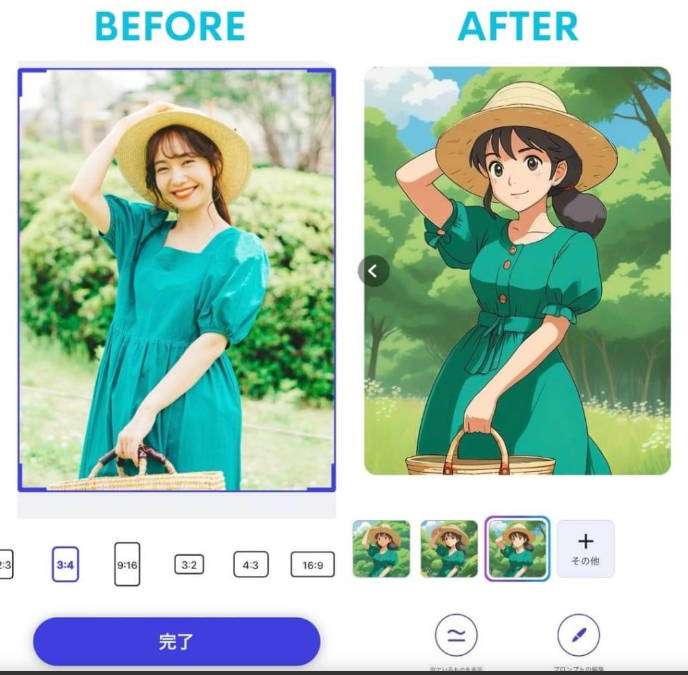 「MyEdit」は、AI写真加工に特化したツールで、ジブリ風だけでなく、ジブリ風、ディズニー風、マンガ風など数十種類以上のアニメスタイルに対応しています。